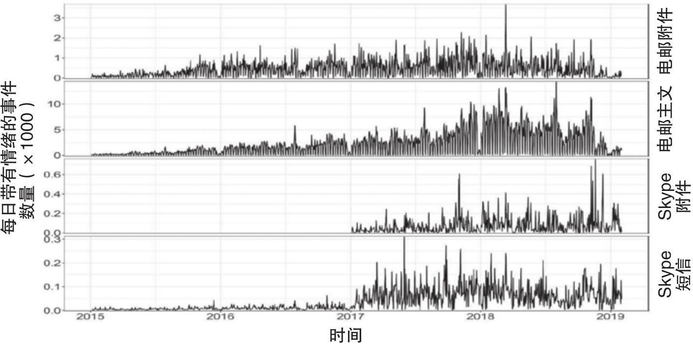 Hafez et al.(2019)通过瑞文公司的自然语言处理引擎来发现事件以及和事件关联的公司,然后对数据进行结构化处理。图1.10刻画了通过瑞文自然语言处理引擎处理的内部数字信息的数量,也就是电邮主文、电邮附件、Skype附件和Skype短信的数量。和上一个案例相似,瑞文的分析师们计算了这些数字信息中所涉事件的情绪得分(ESS),然后从ESS中计算得出看涨或者看跌的交易信号。