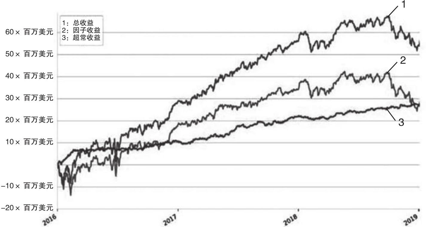 图1.12 1亿美元资管额的多头组合因子绩效分解