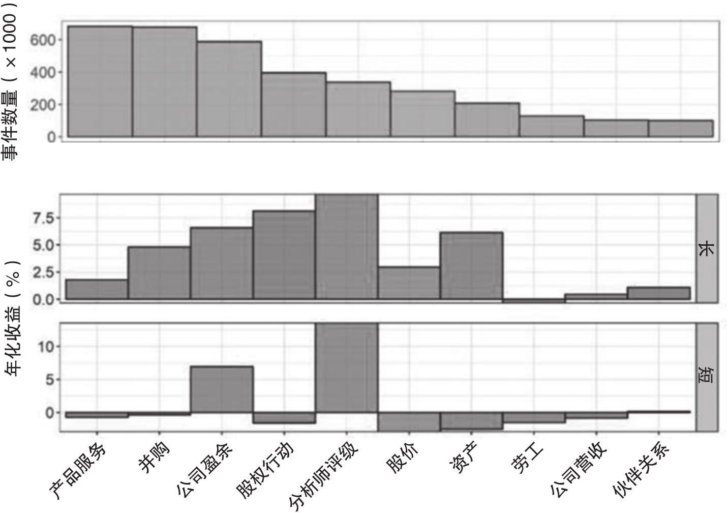 这个案例得到了如下的结论。首先有80%左右和股票相关的事件是在公司内部信息中发现的,而只有20%左右的事件来自于公开新闻和社交媒体。其次,来自内部数据形成的正面情绪信号会给出在几周内都有效的多头信号,而从公开信息中得到的价值则会快速衰减。在各种不同影响公司的事件中,以内部文件数量来说,产品服务(product-service)和并购(acquisitions-merger)的信息含量最多;但是从基于不同事件情绪得分形成的多空组合中,分析师评级(analystratings)、股权行动(equity-actions)、公司盈余(earnings)和资产(assests)等事件则会产生更大的回报率,图1.11就说明了这一点。最后,对于情绪组合的因子风险分析表明,从经典因子模型出发,情绪变化导致的股价异常波动具有持续性,由此可以从中获取超常收益,也就是alpha,而图1.12则说明了这一点。