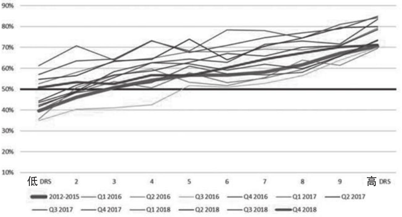 DRS这个指标背后的原理是,当消费需求增强时,公司的收入就会超过市场预期;而当消费需求下跌时,公司的收入就会不如市场预期。而证据表明DRS的确可以预测某家公司收入超出市场预期的可能性以及超出市场预期的幅度,[27]后者可以称之为收入意外(revenue surprise),也就是真实收入和预期收入之间的差额。图1.17表明,从2012年到2015年的初始样本时段,DRS指标排在最后面的10%股票超出市场预期的只有40%,而排在最前面的10%股票超出市场预期的则超出了70%,而处于中间分位的股票打败市场共识的可能性随着DRS的上升呈现单调递增的趋势,如图中线段1所示。与此同时,这种趋势在2015年之后的的各个季度依然稳定地存在,如图1.17中其他线段都呈现往右边递增的趋势。这张图充分证明了DRS这个指标背后的原理。