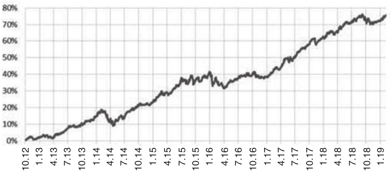 接下来我们要讨论的就是DRS这个对基本面信息的预测指标可否在量化策略中表现良好。现在构造一个多空市场中性组合,也就是做多DRS处于最高十分位的股票,同时做空DRS处于最低十分位的股票,图1.18就刻画了这样一个组合从2012年到2019年初的投资业绩。它表明在大部分市场条件下,基于线上数字化信息形成的对于公司基本面的预测可以得到不错的投资业绩。
