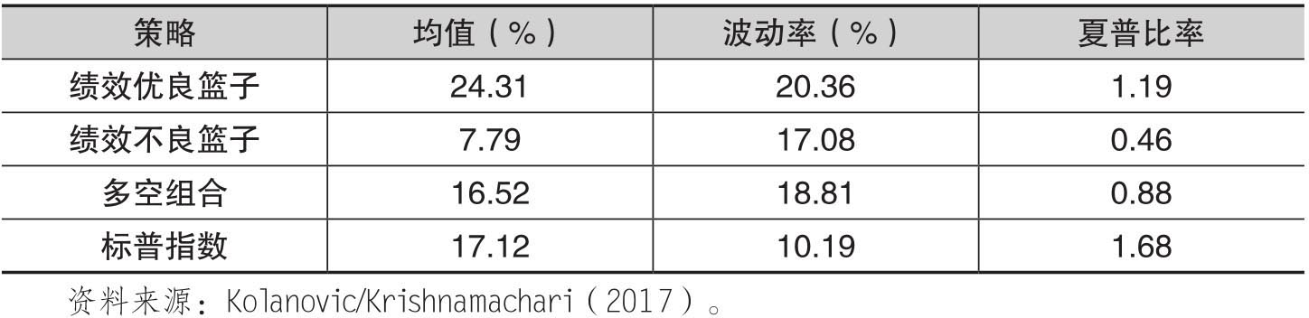 现在考虑如下的股票量化策略。首先是构造两个股票篮子,一个是绩效优良篮子,其中包括销售收入预测值大于分析师收入估计值的股票;另外一个是绩效不良篮子,其中包括预测值小于分析师收入估计值的股票。在某个季度之后的两天在获取相关数据中构建仓位,做多绩效优良篮子中的股票,同时做空绩效不良篮子中的股票,这样的多空组合采用等权重的方式,然后一直持有到公司公告日发布之后的5天。表1.11报告了上述投资策略的绩效。结果表明绩效优良篮子组合会打败标普500指数,而绩效不良篮子组合则劣于标普500指数。这里需要指出的是,多空组合在投资收益上的差异是由绩效优良篮子和绩效不良篮子两个组合收益的差异形成的。考虑到后者的差异为正,因此多空组合的收入就比绩效优良篮子纯多头组合的收益低。但是Kolanovic/Krishnamachari(2017)指出,多空组合和标普500指数之间的相关系数只有0.7%,这近乎就等于0。因此多空组合和市场组合之间就存在着显著的分散化效果。