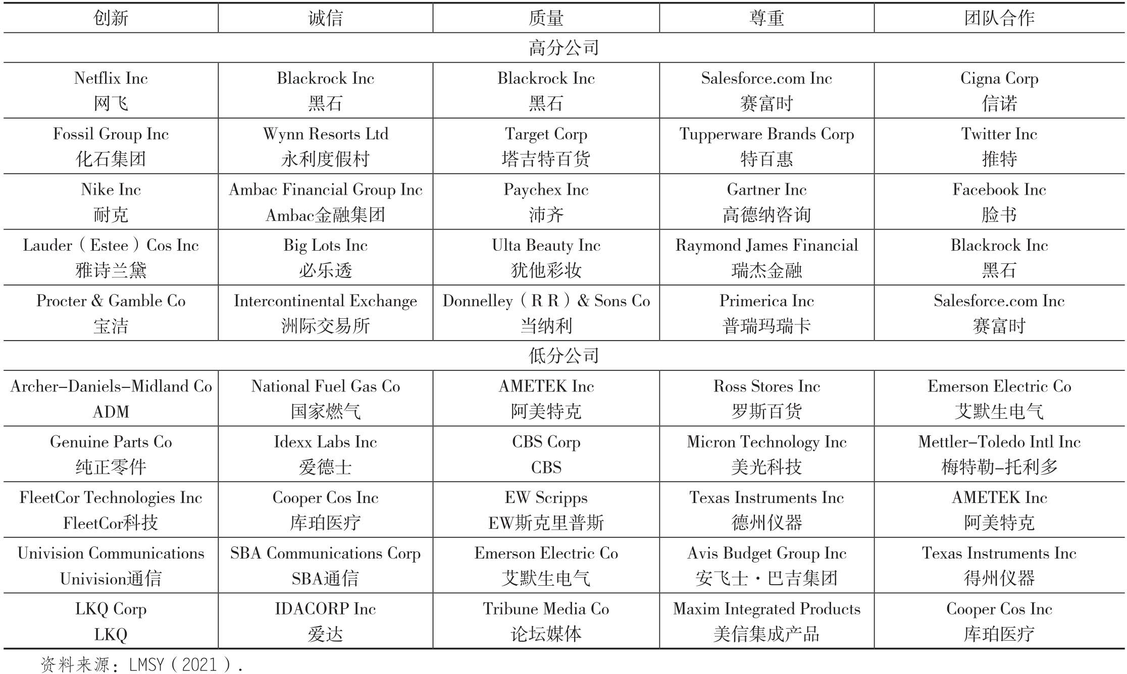 在生成文化词典之后,LMSY就给标普500指数成分股计算了从2001年到2018年在创新、诚信、质量、尊重和团队合作五个与公司价值观有关的得分。表1.22给出了从2013年到2018年得分最高和最低的五家公司。