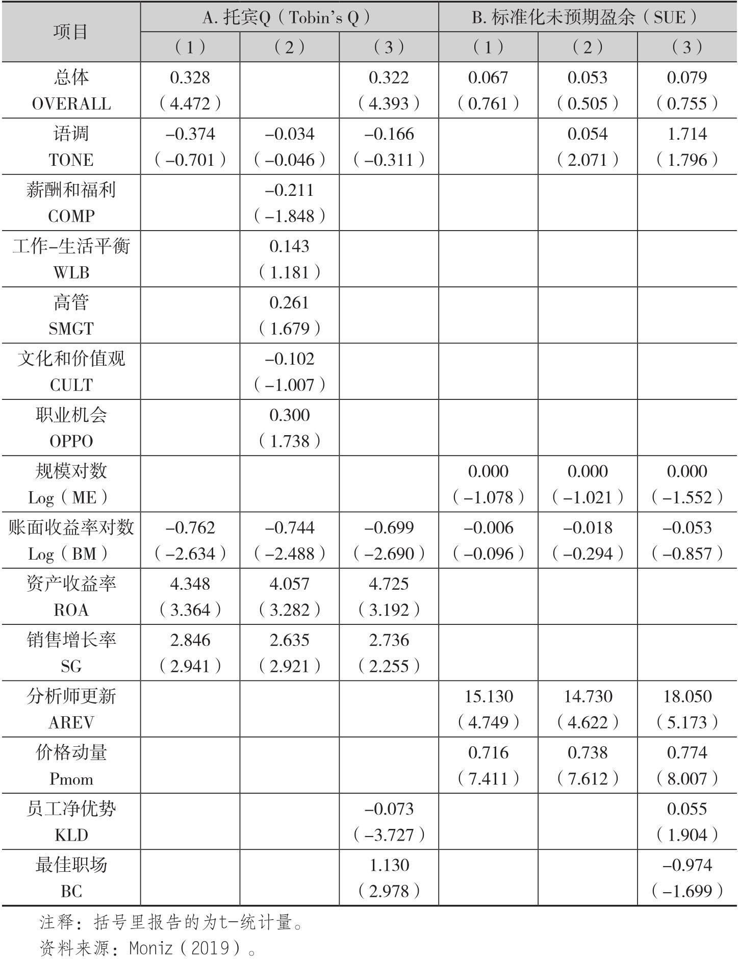 为了分析前述定义的“目标”具有独特的文化含义,Moniz还选择了两个和公司文化相关的指标进行分析。第一个是描述员工关系的指标。这个指标来源于KLD社会研究和分析数据库(KLD Social Research and Analytics Database)。[44]就某家公司而言,在特定年份中把员工关系指标中所有确定的优势相加,然后减去所有确定的劣势,由此就得到了员工净优势(net employee strengths),[45]Moniz把这个指标称为KLD。第二个指标和员工满意度有关,如果某家公司上榜《财富》杂志的“美国百家最佳职场”榜单,那么就设定“最佳职场”(Best Companies/BC)哑变量等于1,否则就等于0。此外,Moniz(2019)还使用CRSP(涉及价格信息)、COMPUSTAT(涉及会计信息)以及I/B/E/S(涉及分析师预测信息)这三个主流的金融数据库得到了用于控制变量的公司基本面指标,包括账面收益率(book-to-market ratio/BM)、公司规模(market equity/ME)、价格动量(price momentum/Pmom)、资产收益率(return on asset/ROA)、销售增长率(sales growth/SG)以及分析师更新(analyst revisions/AREV)。[46]这些控制变量旨在解决我们前面提到的光环效应,也就是当评论人使用公开可得信息来形成对公司的看法时可能产生的偏差。