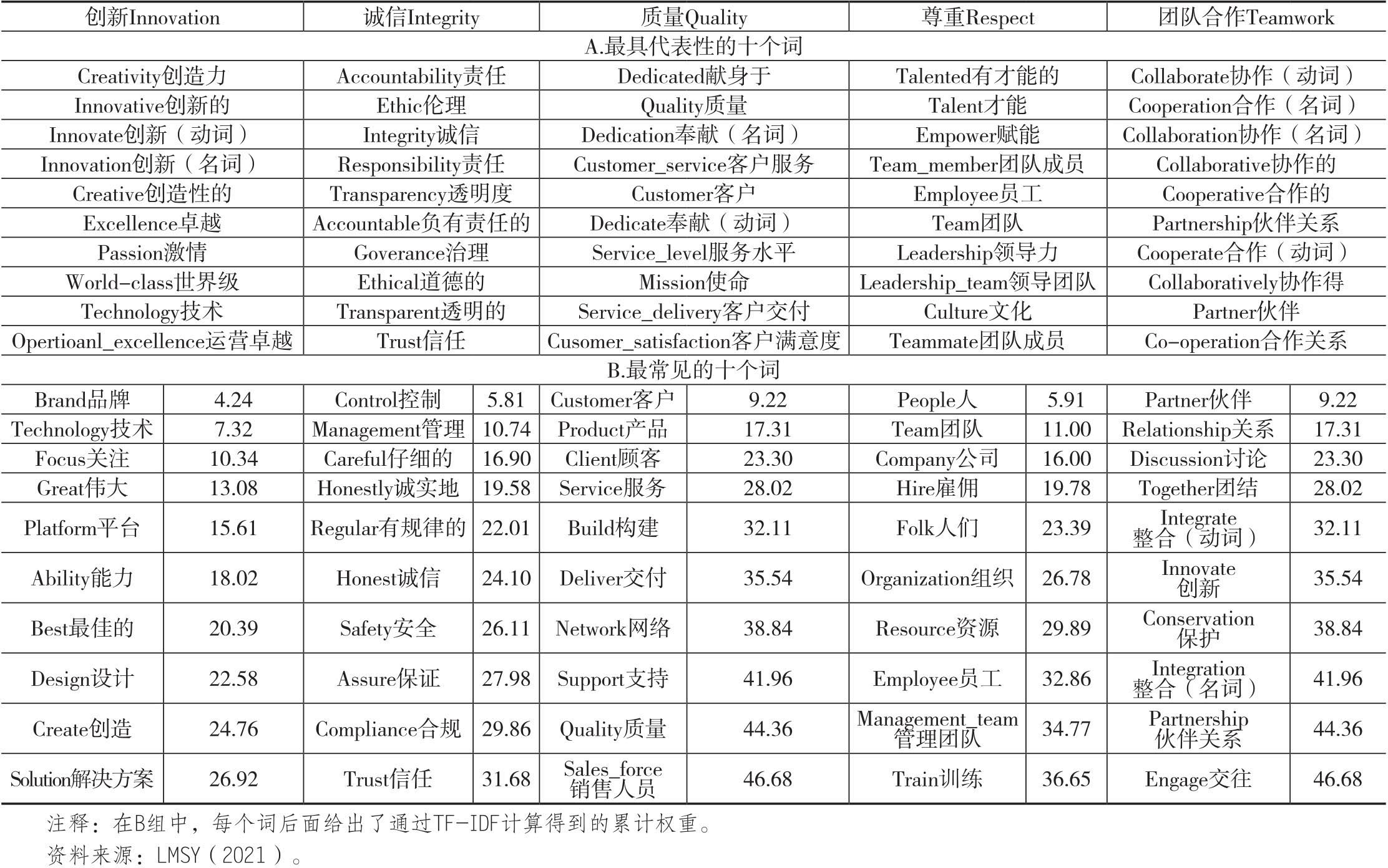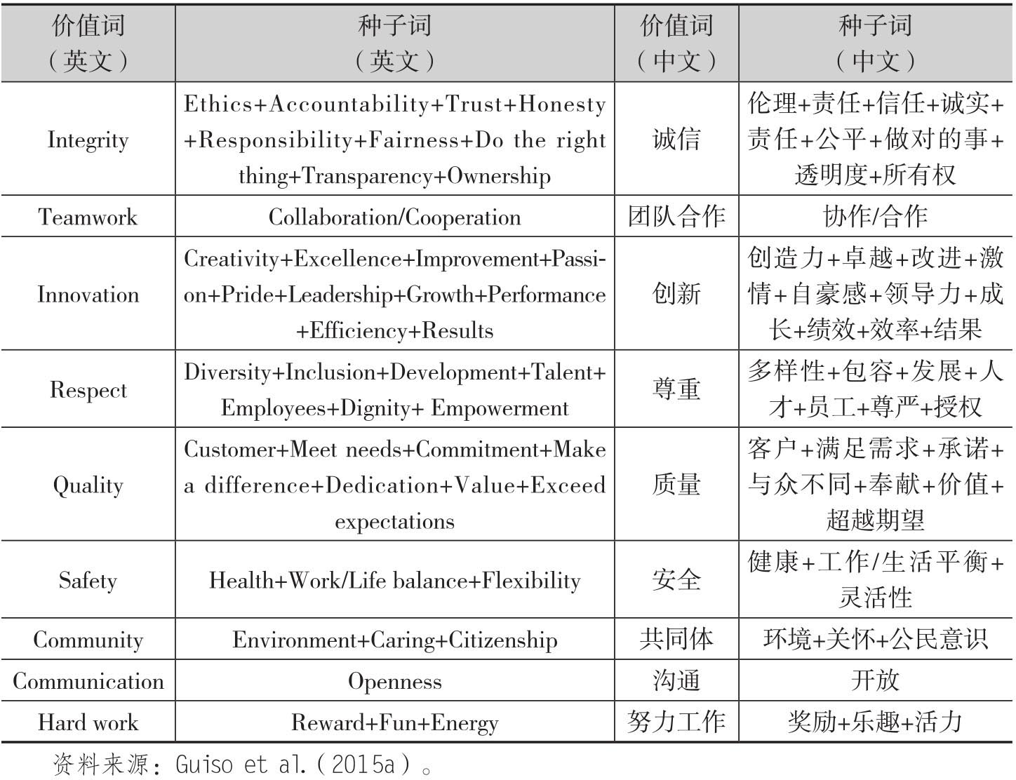 对于上市公司来说,其网站上通常有专门介绍公司价值观、文化和工作环境内容的部分。通常公司会用一些词语来描述核心价值观,我们可以把这些词语称为价值词(value word)。而每个价值词还会通过其他关键词进一步来阐明和解释,以厘清某个特定词语的含义。这些关键词通常被称为种子词(seed words)。我们可以将针对某个价值词语形成的聚类看作是含义单位(unit of meaning),从而可以把公司用来描述特定价值观的所有关键词进行分组,形成不同的价值观维度。例如当公司用“诚实”“伦理”“责任心”等词语来描述“诚信”的价值观,那么所有这些词就可以归为一组。
