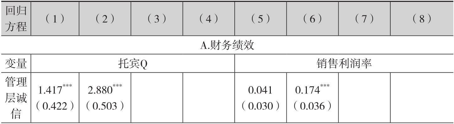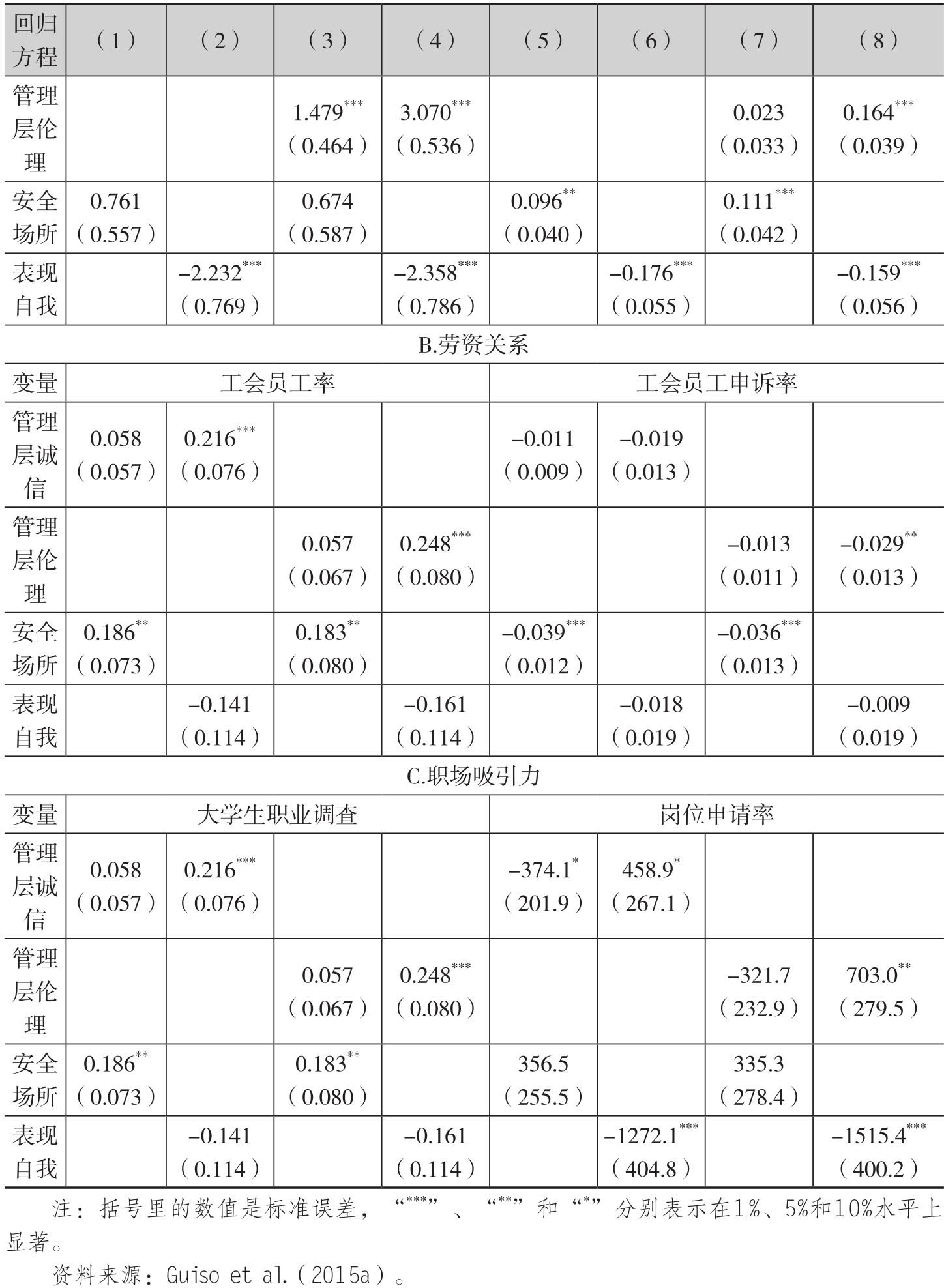 表1.18报告了员工视角下的诚信价值和公司财务以及管理绩效之间的关系,其中涉及了财务绩效、劳资关系和职场吸引力三个方面的问题。表1.18A报告了以托宾Q(前四列)和销售利润率(后四列)为因变量的最小二乘回归结果。从第1列和第2列的数据来看,员工感知的管理层诚信和托宾Q之间存在着统计上显著的关系。如果使用“安全场所”问题反应作为控制变量,那么管理层诚信水平增加一个标准差将会让托宾Q增加0.23个标准差,而如果使用“表现自我”问题反应作为控制变量,那么托宾Q就可以增加0.47个标准差。[38]如果将管理层诚信问题替换为管理层伦理问题,那么第3列和第4列得到的结果是相似的,而且和前一个问题一样,当采用“表现自我”而非“安全场所”问题作为控制变量时,管理层伦理问题的反应对托宾Q影响更大。[39]第5~8列把因变量替换为销售利润率(ROS),我们可以再次看到公司绩效和诚信价值之间的正相关关系,只是在使用“表现自我”作为控制变量时回归系数才具有统计显著性。为了检测结论的稳健性,作者针对托宾Q还使用了其他的控制变量,包括资产收益率(ROA)、研发销售比、标普指数纳入等,结果表明基本的定性结论依然成立。