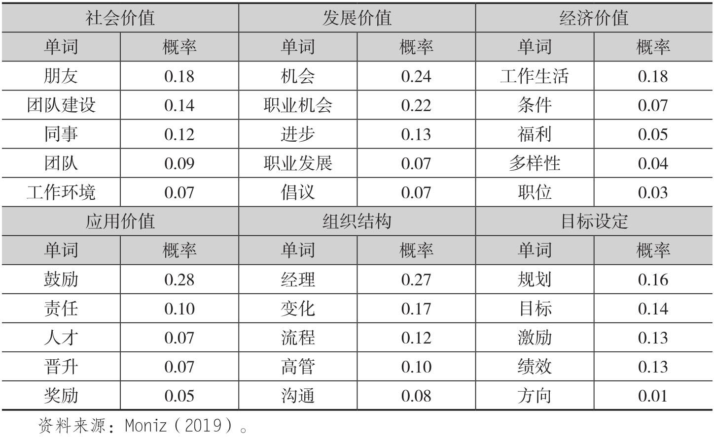 接下来Moniz(2019)介绍了一种不同于Guiso et al.(2015a)的度量公司文化认知的技术,这就是Blei et al.(2003)提出的基于潜在狄利克雷分布(LDA)的主题建模方法。通过LDA的主题建模方法,Moniz针对Glassdoor的员工评论得到了六个主题聚类,如表1.19所示。现在每个聚类表示为语义相似概念的单词分布,表1.19针对每个聚类按照单词在文本中出现的频率,通过降序方式进行排列,由此帮助读者解释聚类的主题含义。