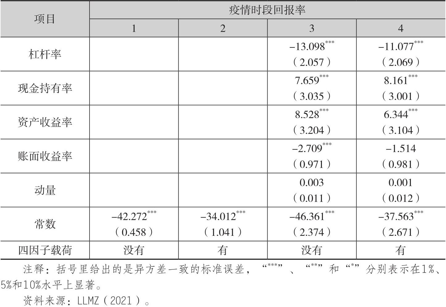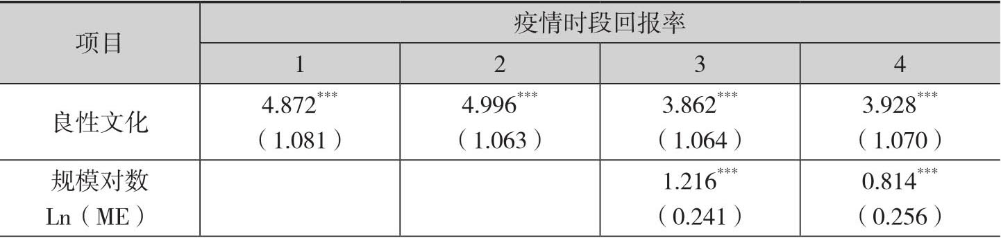 Graham et al.(2018)的调查中,公司高管认为当经济和经营环境变差时,公司文化和公司绩效之间的联系就更为明显。因为良性文化会促使高管和员工能够基于长远的利益共同努力,并且形成一致的决策。在这方面,从2020年初开始遍布全球的新冠疫情(COVID-19)就成为一个重要的分析场景。李凯教授牵头的另外一篇文章Li/Liu/Mai/Zhang(LLMZ,2021)则分析了这个问题。表1.24报告了以回报率为因变量同时以良性文化为自变量的面板回归结果,其中良性文化指标采用了LMSY(2021)的定义。回归的样本时段是新冠疫情爆发初期前后的时段,也就是从2020年1月2日到3月20日之间,同时股票收益率则是根据在这个时段上通过简单持有(buy-and-hold)的方式得出的收益率。
