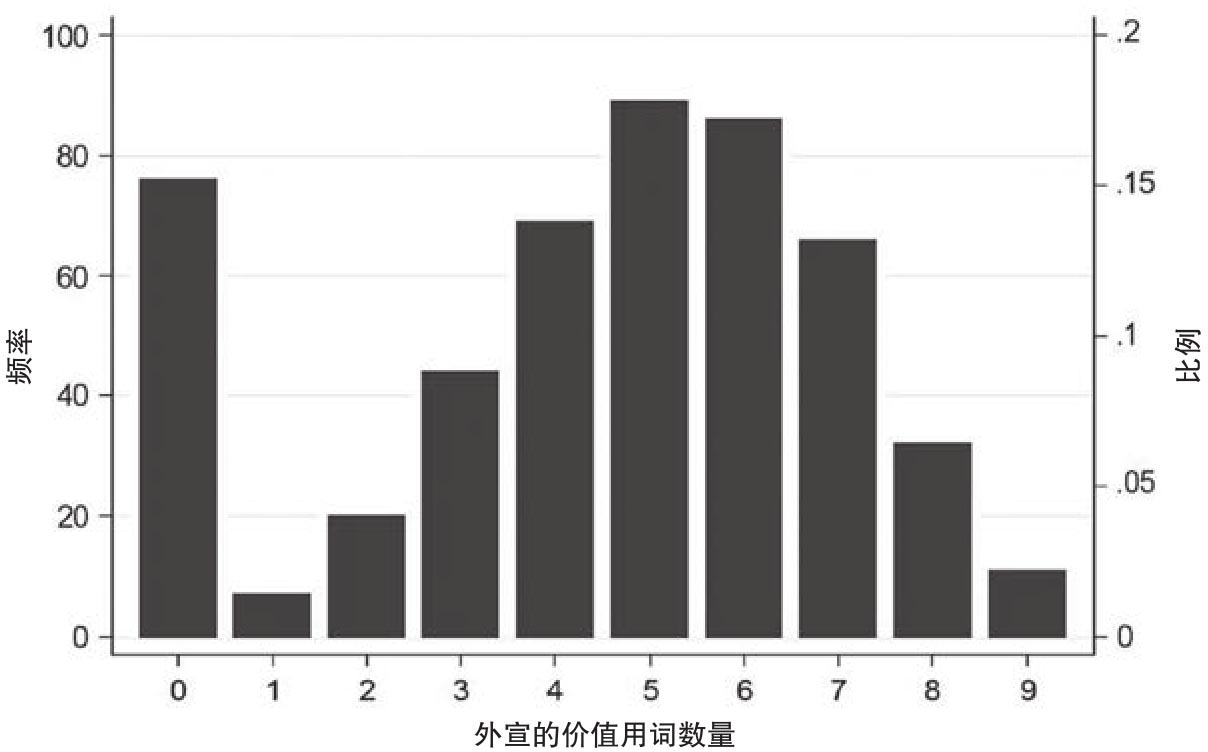 通过上述方式对所有公司网站最经常出现的50个价值用词进行汇总之后,Guiso et al.(2015a)就得到了标普500指数成分股公司网页上刻画价值观的九组词汇集合,如表1.15所示。在标普500指数公司中,有些公司网站的宣传资料并没有涉及上述任何一个价值观,而在大多数存在上述价值用词的公司中,只有一家公司只涉及一个价值观类别,剩下的公司大部分会涉及五个以上的价值观维度。图1.23描述了公司价值观维度数量的分布。