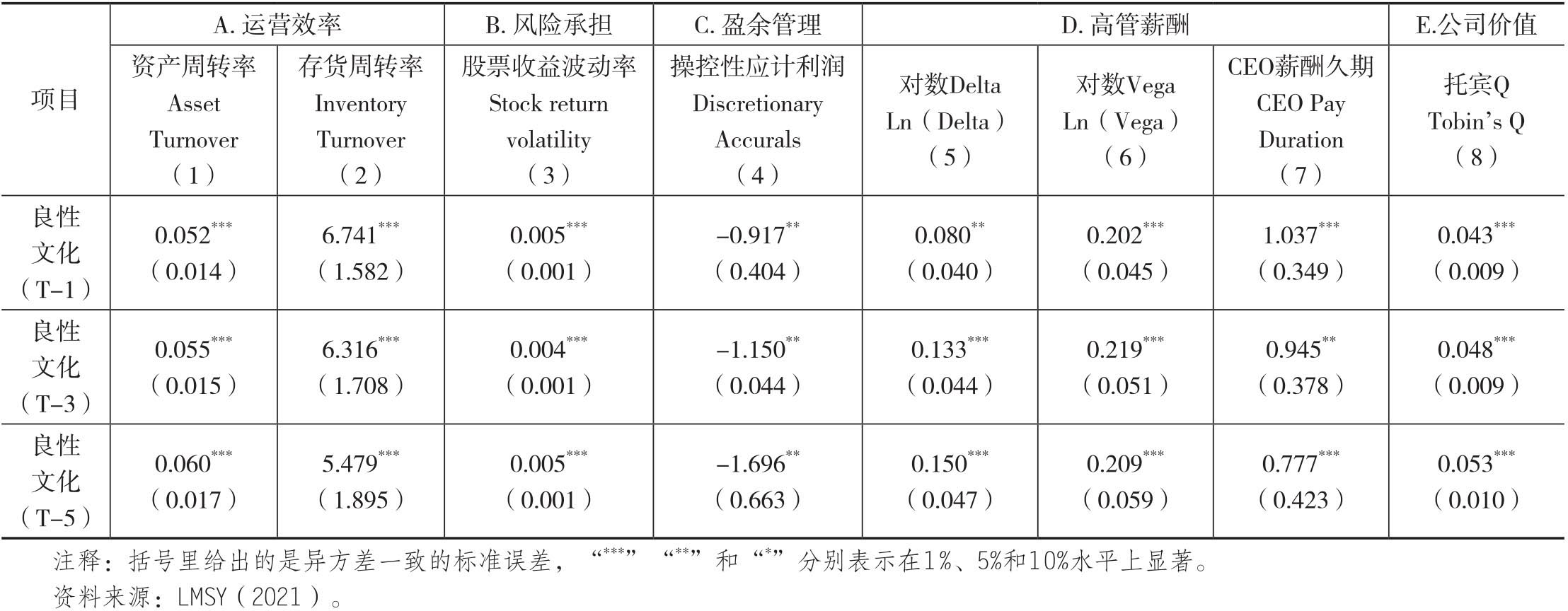 在Graham et al.(2018)做的访谈中,公司高管把文化刻画为“信念系统”、“协调机制”和“看不见的手”。他们会认为公司文化会影响到企业运营的各个层面。这样LMSY就探讨通过上述方法刻画的公司文化在企业的运营效率、风险承担、盈余管理、高管薪酬设计等方面的作用。从先验的角度来看,很难说表1.21中描述的五种价值观更有利于企业的绩效。因为这五种价值观之间存在着较强的相关性。[52]这样LMSY就使用了一个总体指标来确认具有良性文化的公司,具体而言,就是如果一家公司的五种文化价值的总和在所有公司排序中位列前四分之一,那么这个总体指标就取值为1,否则就取值为0。表1.22报告了良性文化对于公司绩效的影响。
