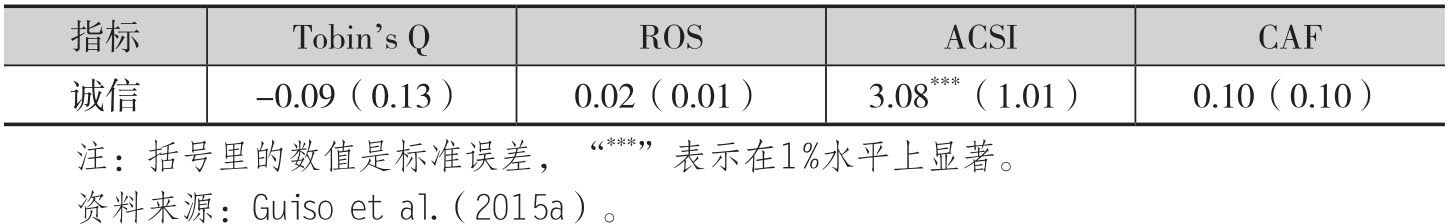 表1.16报告了诚信价值哑变量对这些绩效指标进行回归的结果。从中可以看到,除了消费者满意度这个指标以外,无论是公司的利润率、托宾Q还是集体诉讼的频次,数据表明公司外宣价值和经营绩效之间没什么关系。而消费者满意度这个指标对于那些外宣诚信的公司而言显著较高。Guiso et al.(2015a)还报告了其他维度的价值用词哑变量和公司绩效的关系,结果和“诚信”得到的结果并没有定性的差异。就这个结论而言,一种合理的解释是公司在网站上对外宣传的价值观是为了给公司客户看的,由此就影响到了客户的满意度。但是公司的外宣价值与公司的经营绩效和股市估值之间则没有多少相关性,因为经营绩效和估值会受到其他很多变量的影响。另外一种可能性就是公司的外宣价值只是一种空谈(cheap talk)。对于公司来说,它们在网站上宣称遵循诚信原则的成本接近于0,这样不管公司内部实际存在的价值观是什么,大多数公司都会做这样的宣传。