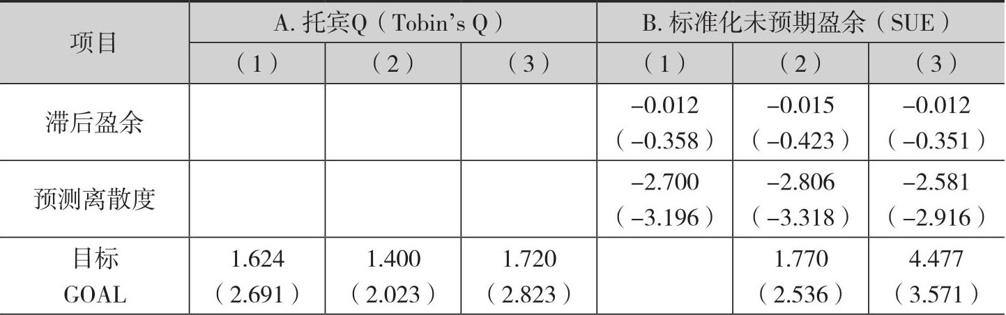 其中Et表示第t季度的盈余,而μUEt和σUEt表示公司在前20个季度未预期盈余的均值和标准差,它们可以用来刻画未预期盈余的趋势和波动率。[48]表1.20B中的回归以SUE为因变量,除了公司规模、账面收益率、分析师更新和价格动量这些控制变量,这组回归还加入了滞后盈余和分析师预测离散度两个控制变量。前者等于上一季度的SUE,而后者则等于盈余公告发布前最近期的分析盈余预测标准差除以盈余波动率。从表1.20B的第2列回归系数来看,“目标”这个自变量的回归系数为正,并且在统计上是高度显著的,这就表明这个指标包含有除了公司基本面或者“语调”之外预测未预期盈余的信息。第3列的回归控制了员工关系和满意度指标,结果表明“目标”中含有这些指标不能覆盖的信息。第二组回归的结果表明,通过LDA方法得到的公司“目标”指标和公司未来的未预期盈余之间存在着显著的统计关系,这说明公司文化对于财务分析明显是有用的。