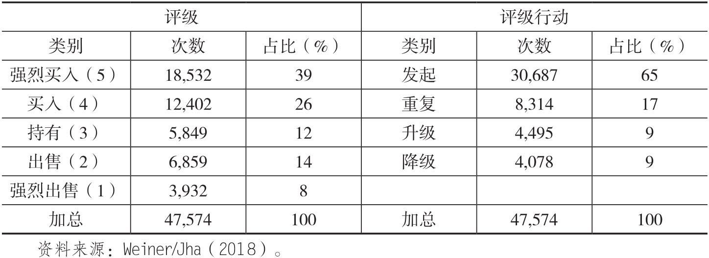 ExtractAlpha的Weinar/Jha(2018)分析了ClosingBell股票评级数据的投资含义,研究的对象是2014年4月到2018年的美国股市,涉及ClosingBelld 4.8万个评级。这个数据集中的股票评级分为5类,包括强烈出售、出售、持有、买入和强烈买入。和卖方分析师建议一样,正面评级(买入)要比负面评价更多。对同一个用户当前给出的评级而言,评级行动有四种:发起(initation)、重复(reiteration)、升级(upgrade)和降级(downgrade)。这里大多数的评级是发起。表1.27给出了样本中的评级和评级行动的分布情况。需要指出的是,这个数据集还有一个标注,以此说明当用户在连接到经纪账户的情况下是否在所评级股票上持有仓位,大约6%的评级记录中存在这样的标注。自从2015年期初开始,这个数据集每个月覆盖超过400只的股票,同时每个月大约有100~200个用户参与评级。在Weinar/Jha(2018)的分析中,和ExtractAlpha的很多用例一样,为了满足流动性要求,股票范围被限定在市值超过1亿美元、日平均交易量超过100万美元并且名义股价高于4美元的股票上。