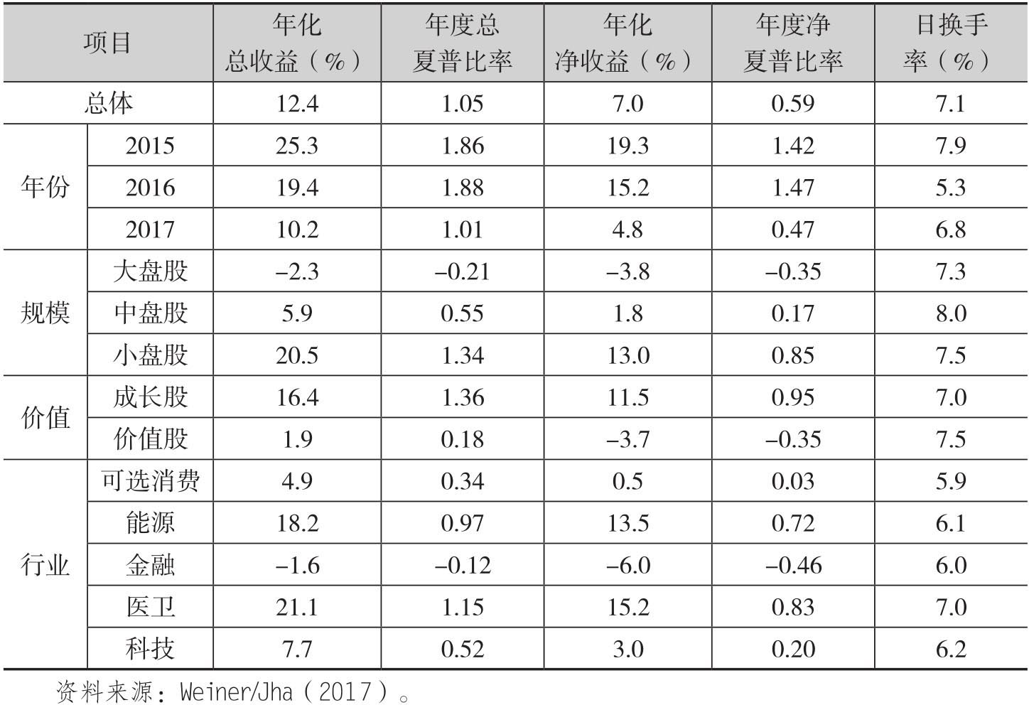 接下来对所有满足流动性要求的股票基于上述信号进行排序,然后做多这个信号最大十分位的股票组合,同时做空在最低十分位的股票组合。每个股票组合采用等权重的方式,同时每日按照收盘价进行再平衡。Weiner/Jha(2017)同时考虑了不考虑交易成本下的总收益和考虑交易成本下的净收益情况,对于后者而言,大盘股的交易成本是2个基点;中盘股是5个基点;而小盘股是10个基点。表1.28报告了这个交易信号的投资绩效。