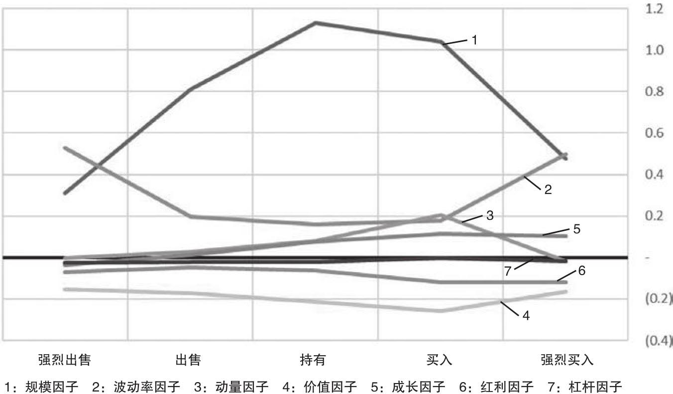 Weinar/Jha(2018)首先分析了有评级股票的风险敞口。对于各个风险因子,首先进行了标准化处理,也就是让它们的均值为0,标准差为1。图1.25给出了不同评级股票的风险敞口。就规模因子而言,强烈买入和强烈出售往往集中在规模更小的股票上。同时强烈买入和强烈出售的股票要比其他股票波动更为剧烈。和负面评级的股票相比,正面评级的股票具有略微更多的一些成长性,以及更少一些的价值性和收益性,但是它们中间的差异并不是很大。有趣的是,在动量因子上存在轻微的非线性特性,也就是说买入评级的股票要比强烈买入的股票具有更强的动量效应,这可能反映了评级提供者的一些“逆向投资”(contrarian investment)的行为。