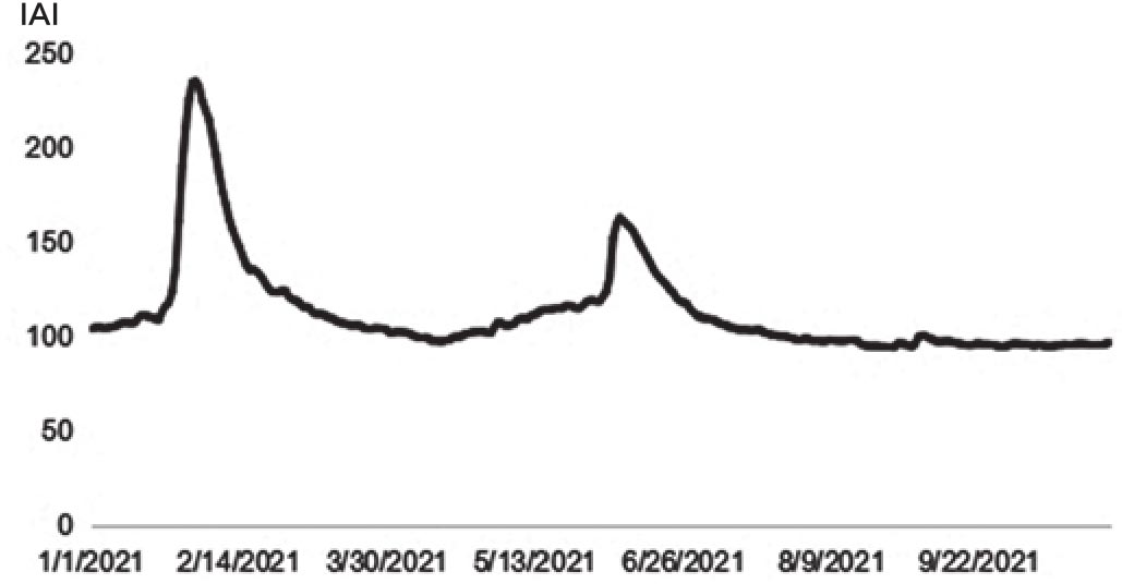 投资百科(Investopedia)是金融教育网站,其中包含有大量市场和经济运行的相关信息。如果在谷歌上搜索一个常见的金融词语,例如“债券市场”(bond market),此时投资百科关于解释债券市场的词条就很可能在搜索引擎的第一页弹出。上一小节介绍了基于谷歌搜索流量的投资含义,与之相比,投资百科是专门做投资科普的平台,因而这个网站上的搜索流量也应该具有投资洞见。在这方面,投资百科创建了投资者焦虑指数(Investopedia Anxiety Index/IAI)。它是根据全球数千万投资百科阅览者在这个网站上围绕三个重要经济议题的阅览行为开发的投资者情绪指标。这三方面的经济议题是:(1)宏观经济(例如通货膨胀和通货紧缩);(2)负面的市场情绪(例如做空和波动率);(3)信贷(例如违约、清偿和破产)。这个指数等于100时表示市场情绪是中性的,图1.29给出了2021年前11个月的IAI指数。