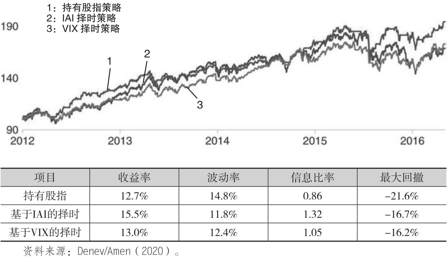 与Amen(2013)基于谷歌冲击情绪指标创建的择时策略相似,Amen(2016)分析了基于IAI指数和VIX指数形成的标普500指数择时策略,并且和简单持有这个指数得到的投资收益进行了比较。其背后的思想是:当IAI指数或VIX指数高企时,投资者就抛掉标普500指数,并且持有现金;而当这两个指数处于低点也就意味着投资者对未来感到乐观的时候就持有标普500指数。图1.31给出了三种投资策略的累计收益。从中可以看到,风险调整收益率最低的策略就是简单持有标普500指数,而基于IAI和VIX指数的择时策略投资绩效都要优于前者。同时在所有三种策略中,基于IAI的择时具有相对更高的风险调整收益和更低的最大回撤,这就表明相比从期权市场价格中倒算出来的VIX指数,IAI指数用来衡量投资者恐惧情绪具有额外的价值。