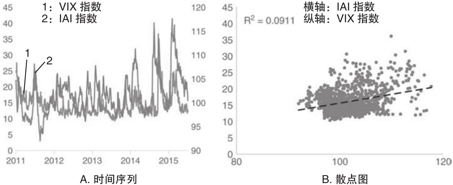 Amen(2016)分析了IAI指数和VIX指数,图1.30A给出了两者从2011年到2015年的时间序列,而图1.30B则给出了以VIX指数为纵轴、IAI指数为横轴的散点图。图1.31表明这两个指数具有较强的关联性。在Amen(2016)所分析的样本时段上,两者的相关性大约是30%,而VIX指数相对IAI指数回归的R2约为9%。