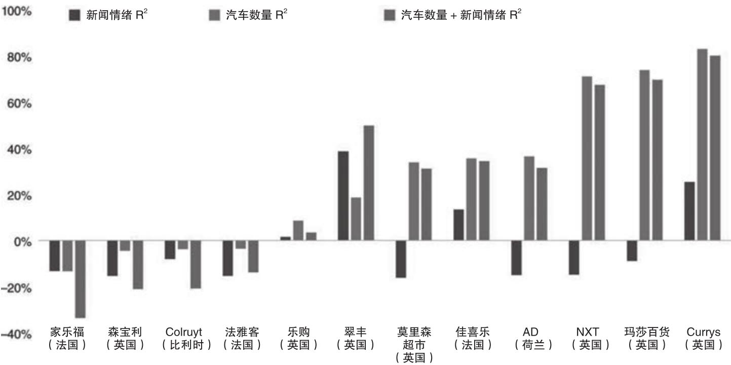 和图2.2的分析类似,现在Denev/Amen针对表2.1中的每家欧洲零售商计算了三个以公司发布的真实盈余为因变量的线性回归。第一个线性回归以新闻情绪指标作为自变量,第二个线性回归以汽车计数指标作为自变量,第三个线性回归则以上述两个另类数据指标作为自变量,由此得到了图2.3的调整结果。