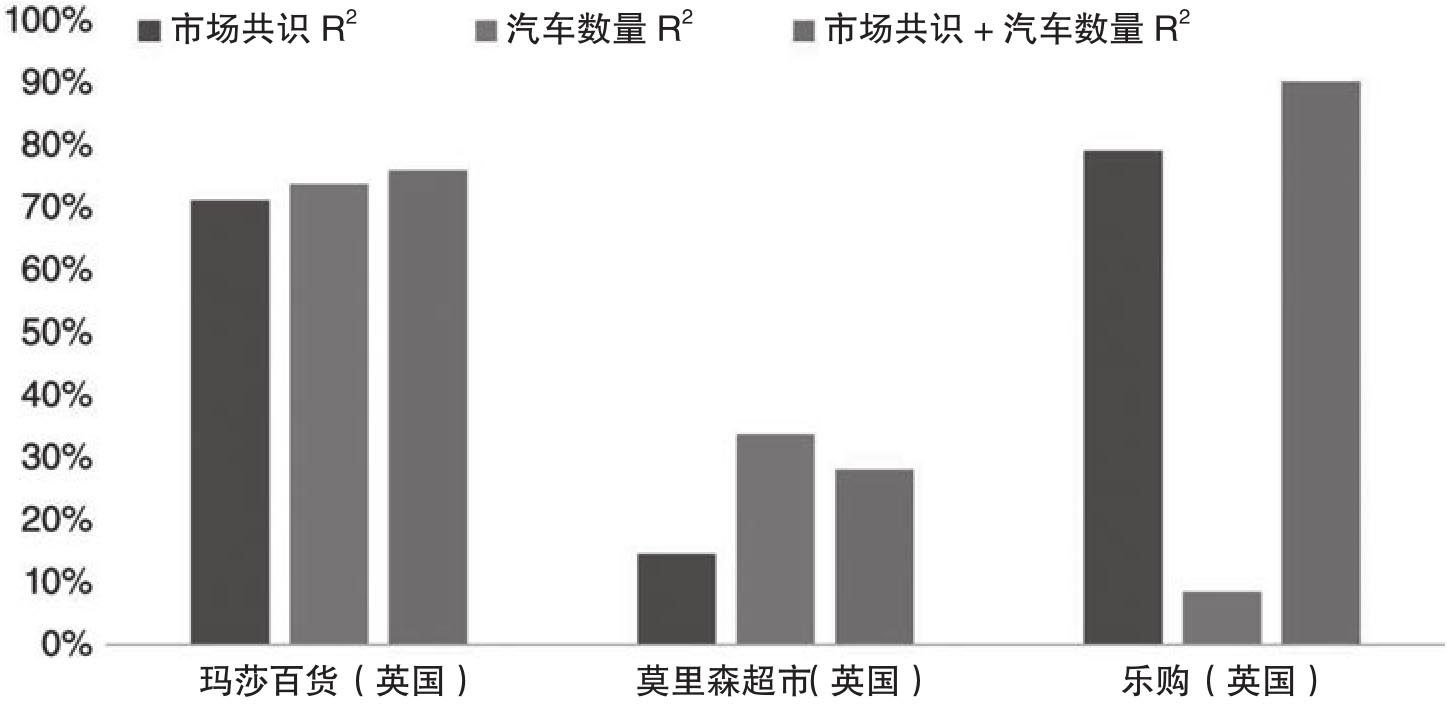 接下来Denev/Amen讨论了汽车计数指标和市场共识数据相比是否可以提供更多的见解。就此他们针对玛莎百货(MKS)、莫里森超市(MRW)和乐购(TSCO)这三家零售商分别做了三个简单的线性回归。在这些线性回归中因变量是公司发布的真实每股收益;第一个回归中使用的自变量只有市场共识数据;第二个回归中使用的自变量只是汽车计数指标;第三个回归则同时使用上述两个指标作为自变量。图2.2报告了这些回归的拟合优度(调整)。该图表明,对于这三家公司,和仅仅使用市场共识的数据相比,汽车数量数据有助于增加调整,因此在预测公司盈余方面汽车数量数据会有额外的信息含义。
