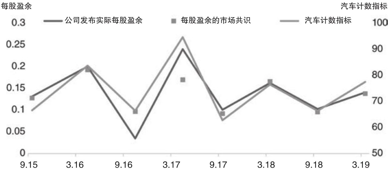 图2.1给出了玛莎百货(Marks and Spencer/MKS)的汽车计数指标、公司发布的实际每股盈余以及市场盈余共识时间序列,其中后面两组数据来自于彭博终端。图2.1表明汽车计数指标和实际的盈余公告以及市场预估有着密切的关系。