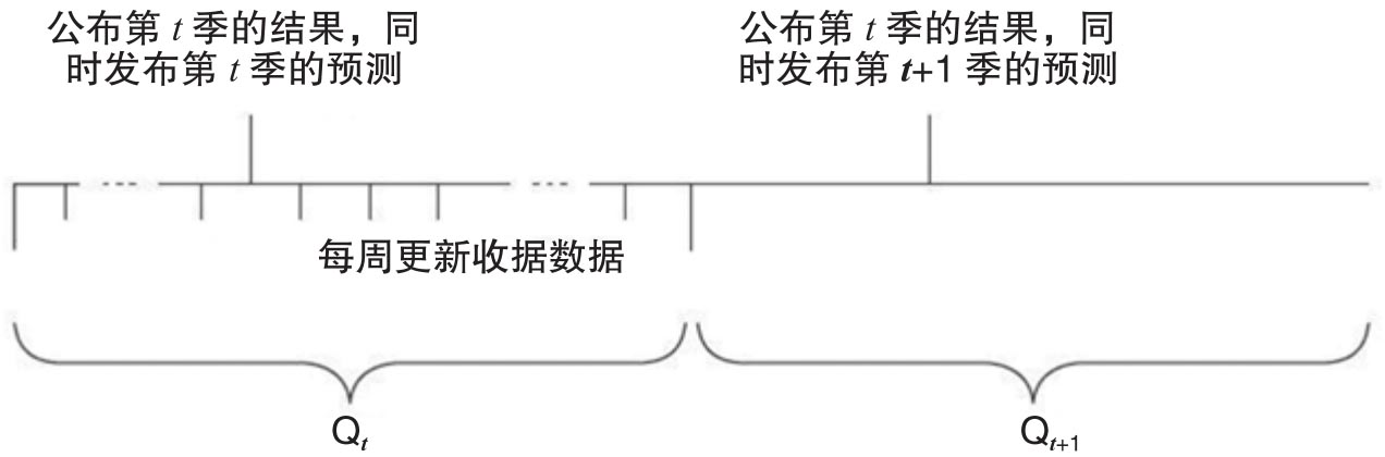 为了预测亚马逊公司的季度销售额,De Rossi et al.(2019)使用了Quandl的电邮收据数据以及公司管理层预测数据。[11]图2.13表明的是预测的时间线。第t季度的真实销售额是在t+1季中公布,同时管理层在t+1的季中公布针对该季度的财务预测。而电邮收据数据是每周更新一次,这样电邮收据数据记录的第t季度交易信息在每个季度后的几天内就可以得到了,因此我们就可以在每个季度结束以后很快生成对于当季的预测。此外,因为每周数据更新一次,所以随着新数据的出现,我们就可以在每个季中的时点生成即时预测。