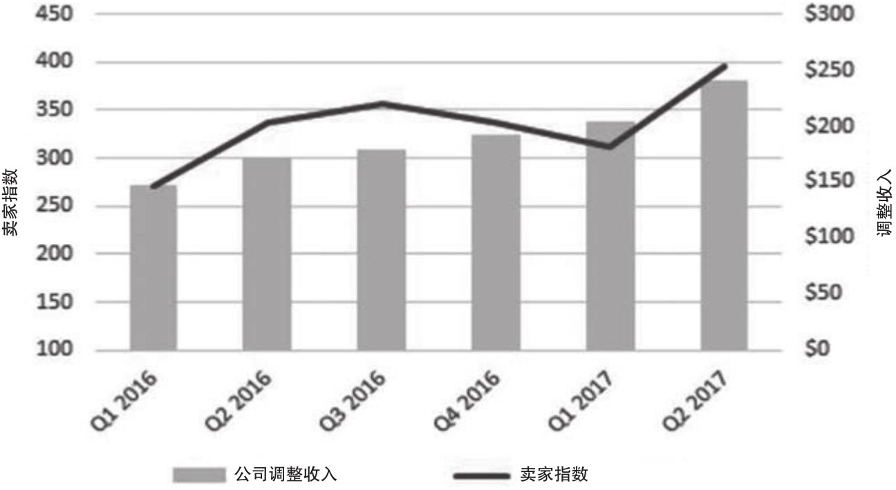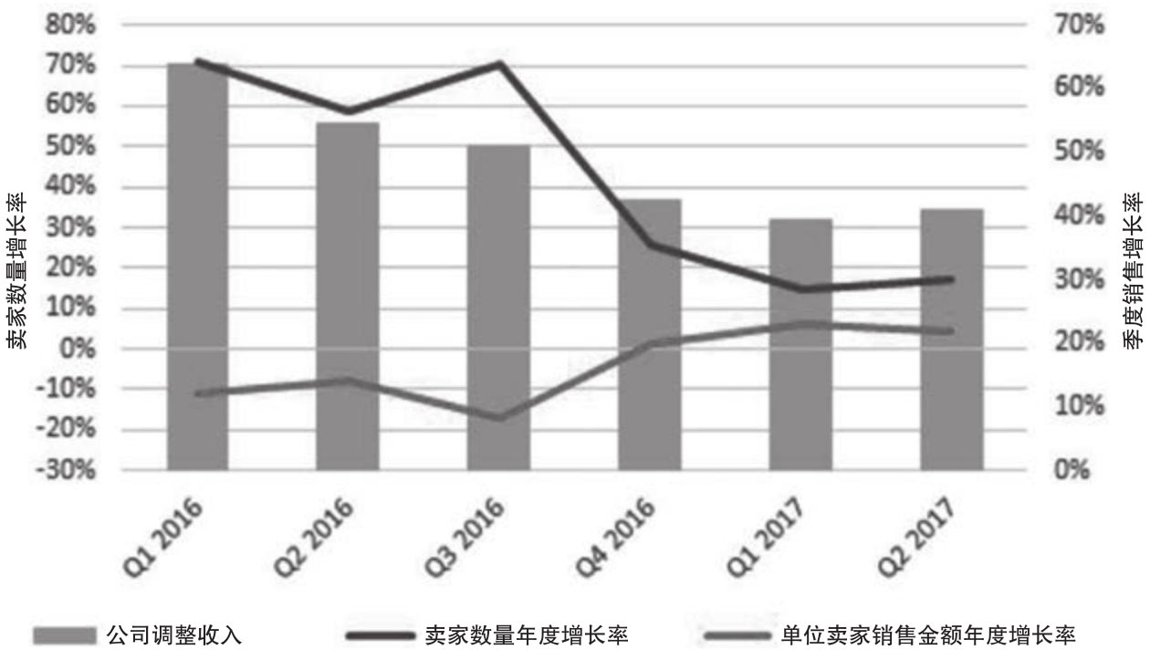 图2.9 公司收入、卖家数量和单位卖家销售金额年度增长率