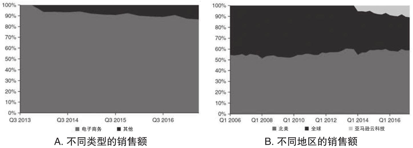 亚马逊公司每个季度会按照类型和地区公布季度销售额。图2.11A报告了两大类业务的销售额占比,也就是电子商业和其他业务的销售额,在其他业务中很重要的一块是亚马逊云科技(Amazon Web Services/AWS)。该图表明,尽管云服务这一块发展很快,但是从电子商务中得到的销售额依然占据了公司销售额很大的一部分。[10]而图2.11B则表明,来自北美地区的客户销售额占据了销售总额一半以上,而北美地区的客户可以认为主要是来自美国的客户。