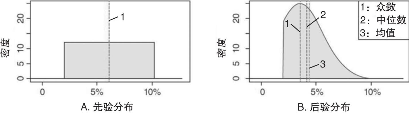 De Rossi et al.(2019)通过贝叶斯统计的方法把上述两种数据结合在一起,进而形成对销售增长率的预测。举例来说,在2016年第三季度,管理层预测亚马逊的销售额介于310亿美元到335亿美元之间,这样相比于第二季度的304亿美元而言,季间增长率就是介于2%和10.2%之间。如果Quandl得到的电邮收据记录显示亚马逊用户在第三季度比第二季度多花了3.6%,那么就可以使用3.6%作为增长率的估计值。当然3.6%相对靠近2%的管理层预测下限。而如果Quandl的数据显示的增长率达到了12.5%,那么可以认为亚马逊的销售增长率很可能处于管理层预测范围的上限,这个时候可以使用10.2%作为增长率的估计值。通过这个简单的例子可以看出,管理层预测数据是先验信息,而电邮收据的信息则体现了对于先验信息的贝叶斯调整,进而形成销售增长率的后验分布。图2.14就描述了这个信念更新的机制。图中表明先验分布仅仅使用了管理层预测的增长率范围,比如介于2%和10.2%之间,而电邮收据数据则表明销售增长率分布的众数是3.6%。