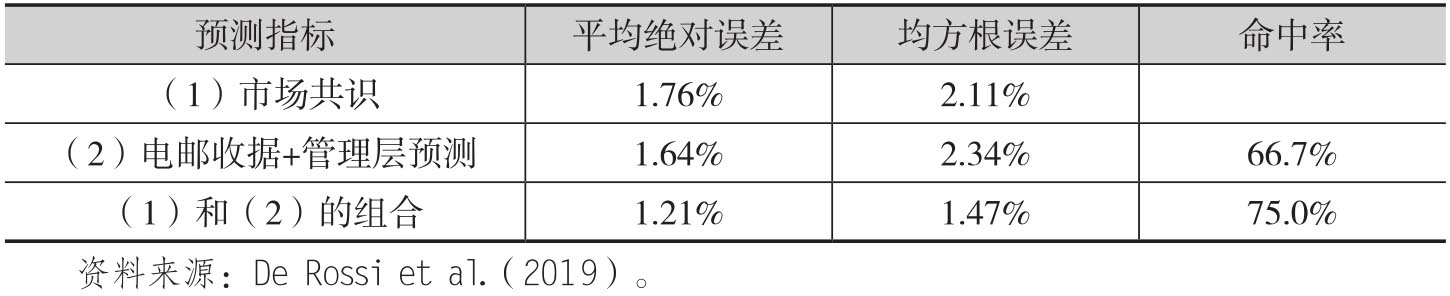 为了比较从管理层预测数据和电邮收据数据中得到的销售增长率,De Rossi et al.(2019)还使用了从I/B/E/S得到的分析师平均估计值,后者可以代表市场共识。这个数据可以在每个季末的一周之后得到。在这个时间点上,Quandl已经把上一季度客户交易的数据处理完毕,并且添加到数据集中。因此这个时候我们可以同时得到电邮收据和分析师预估代表的市场共识这两种预测。表2.5对比了几种方法的预测绩效。从中可以看出,就平均绝对误差(mean absolute error/MAE)这个指标来看,基于电邮收据的预测要好于市场共识的预测,但是从均方根误差(root mean square error/RMSE)来看,市场共识的预测绩效会更好。De Rossi等人就指出这是由于样本早期时段上少数异常值导致的。第三列给出的是命中率(hit rate)指标,它表示在样本时段上电邮收据数据可以改进市场共识的次数。结果表明,在2/3的时段上电邮收据数据可以做到这一点。最后一行把在市场共识以及电邮数据和管理层预测这两个方法得到的结果取简单平均,结果表明平均绝对误差和均方根误差会进一步下跌,同时命中率提升到3/4的水平。