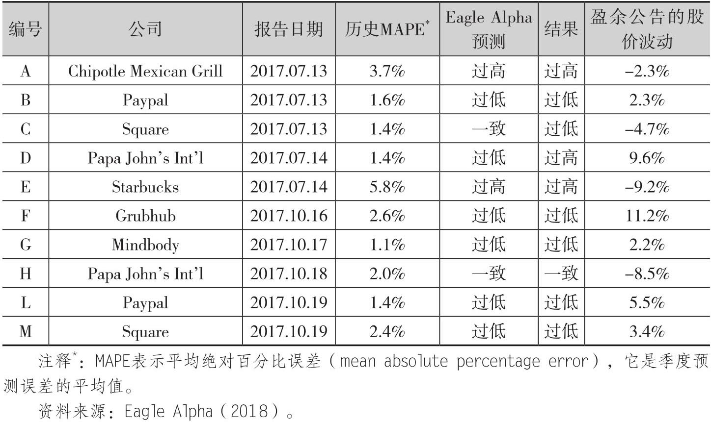 在第一个用例中,Eagle Alpha的数据分析团队讨论了从2017年7月以来根据电邮收据发布的10份公司季度预测报告,如表2.4所示。在每个报告中,Eagle Alpha都构建了基于电邮收据数据的个股预测模型,然后发布报告表明Eagle Alpha的预测相对于市场预期是过高、过低还是一致的。在这十份报告中,我们可以看到有八份报告从事后结果来看是正确的,而报告C和D事后被证明判断错误了。而且最后一列的股价波动数值表明电邮数据中包含可以带来超额收益的信号。