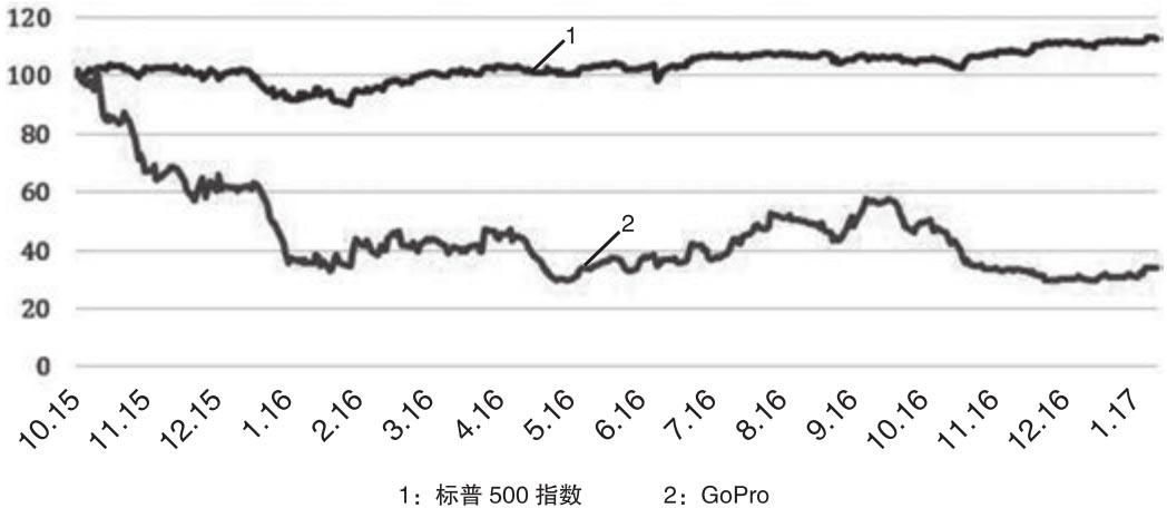 图2.20 指数化价格变化:GoPro对比标普500指数