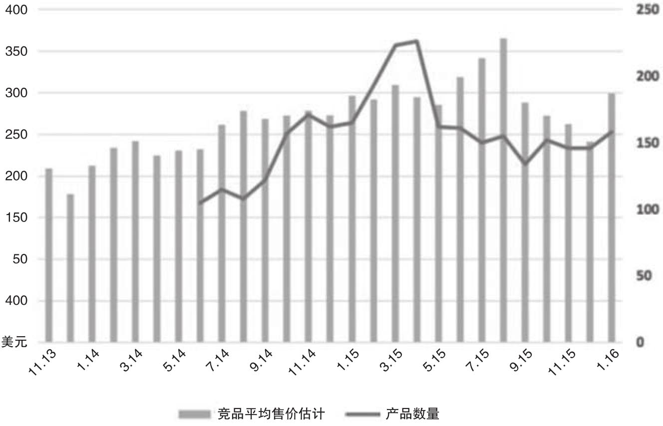 随着极限运动相机平均售价的变化,GoPro公司的命运也就随之起伏。在2014年第四季度和2015年初,高端极限运动相机的平均售价达到历史高点,因此GoPro公司股价创历史高点,投资者情绪在不断增强。从2014年11月到2015年3月之间,平均售价持续上升,而产品数量则维持稳定,图2.18就说明了这一点。另类数据很好地抓取到这个市场饱和的模式,由此就让投资者可以在传统数据预示公司风险之前看到这一点。