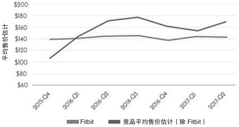 更为重要的是,图2.17表明Fitbit在维系市场份额的同时并没有降低平均售价。结合传统的公司财报数据,网络抓取的产品和价格数据表明Fitbit在2017年第一和第二季度的销售改善,同时平均售价没有下跌。这些销售趋势的变化并没有体现在2017年第一季度报告的收入中,因为当时在渠道商那里还有过多的库存。Fitbit的管理层曾经在第一季度财报电话会议中指出一季度的库存减少了30%,由此表明第二季度渠道商面临的压力会得到很大程度的缓解。