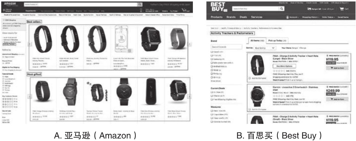 不过很多投资者并不知道的是Fitbit基本面正在发生变化,但是传统数据无法捕捉到这个事实,而Eagle Alpha从网络电商平台上抓取到的价格数据则体现了这一点。图2.15给出了在亚马逊(Amazon)和百思买(Best Buy)这两个电商平台上的产品和价格信息。