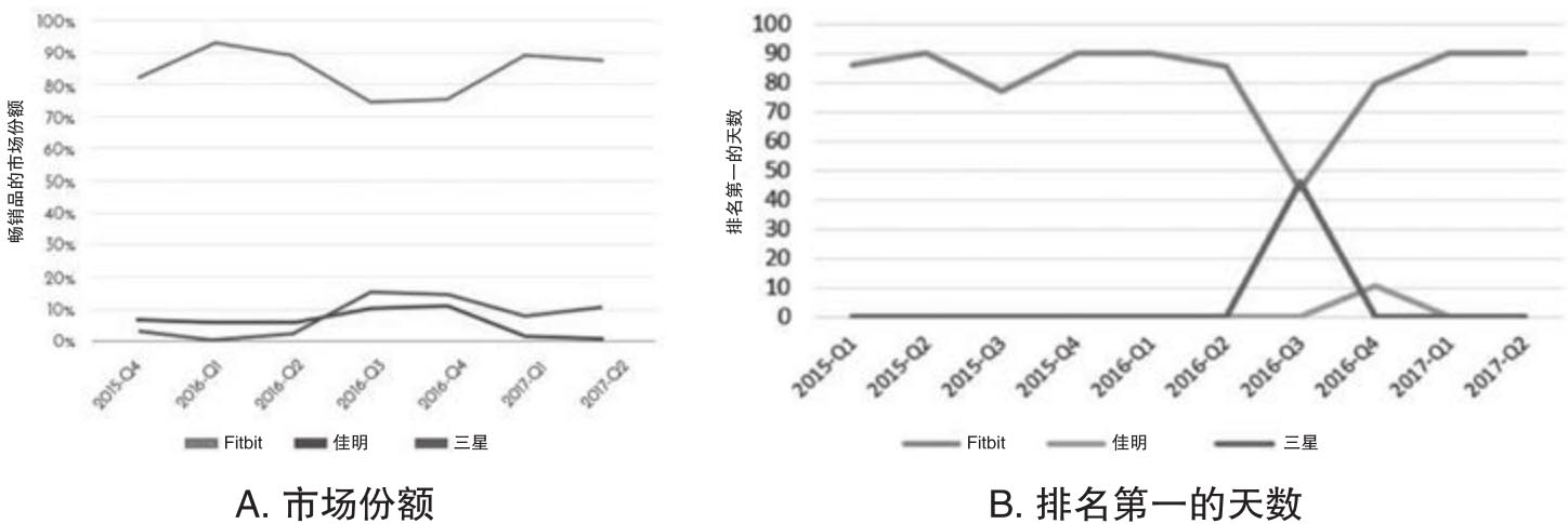 通过跟踪这些电商平台上的销售数据,Eagle Alpha推断出Fitbit的可穿戴健身手表的数量稳定下来,这就表明竞争对手的数量不会再增加了。接着如图2.16A所示,尽管受到了来自Garmin和三星公司的竞争,但是Fitbit在2017年第一季度恢复了在畅销品市场的份额,同时在第二季度还继续维持着这一比率。同时图2.16B中Fitbit健身手表综合排名第一的天数也表明了类似的结果。