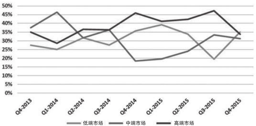 图2.19表明,从2013年第四季度到2015年第四季度,可穿戴运动相机的高端、中端和低端市场经历了一波从区分到收敛的过程,最终三个市场的份额大致相当。通过从网络上抓取的大量价格数据,Eagle Alpha抓住了这个消费者偏好变化的趋势,并且在2016年2月9日发布的报告中进一步指出了GoPro面对的价格压力,以及在低端相机上的增长无法弥补中高端产品价格和市场份额收缩带来的损失。这样GoPro公司产品需求就存在着压力,而且平均售价这个指标依然表现不佳。到了2016年第三季度,Eagle Alpha的分析表明运动相机市场的关键元素趋于稳定,但是压力依然存在。