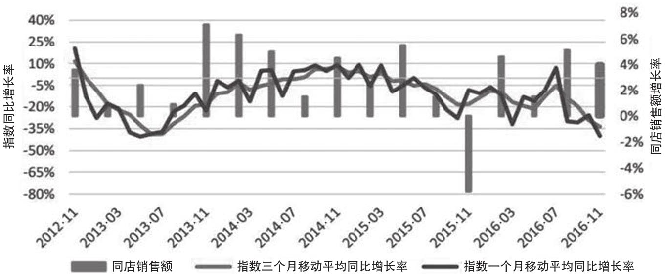 在2016年底之前的18个季度中,搜索指数形成的拐点指标达到了78%的命中率,也就是说搜索指数的三个月移动平均在78%的时间上和当季的同店销售额(same-store sales/SSS)是同向变动的。