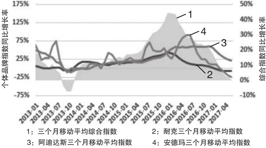这两家体育用品公司的负面趋势让Eagle Alpha对这个行业进行了更深入的调查,寻找让公司管理层做出错误判断的原因。就此Eagle Alpha利用谷歌趋势数据为全球三大体育用品服务商——阿迪达斯(Adidas)、耐克(Nike)和安德玛(Under Armour/UN)——创建了运动服装和运动鞋指数,如图2.22所示。从该图中可以看出,基于谷歌搜索数据形成的三家公司三个月移动平均综合指数在2016年初达到高峰后持续稳定了一段时间,然后从2016年中开始出现下滑。而在公司个体层面,耐克的三个月移动平均指数在2016年初首先开始下跌,然后安德玛和阿迪达斯的三个月移动平均指数分别在2016年中和2016年末开始下跌。