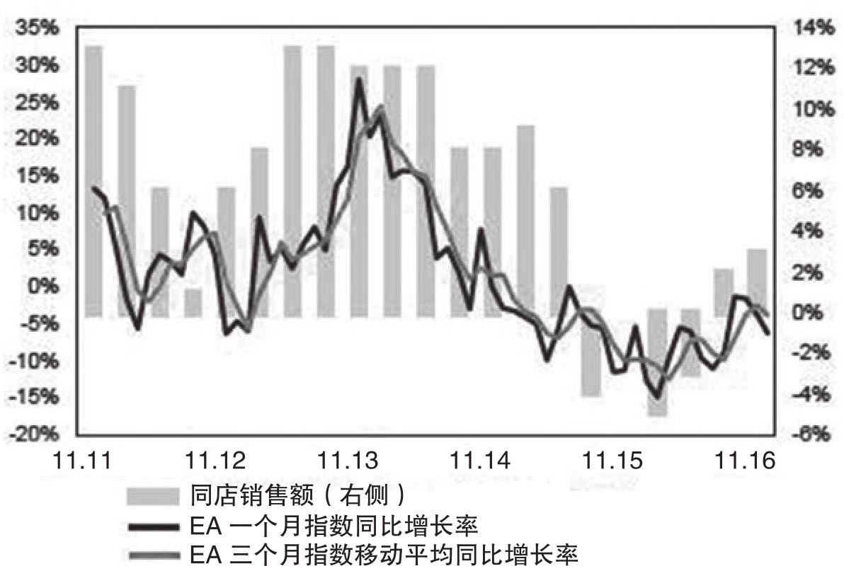 图2.23 博柏利同店销售额和Eagle Alpha(EA)搜索指数
