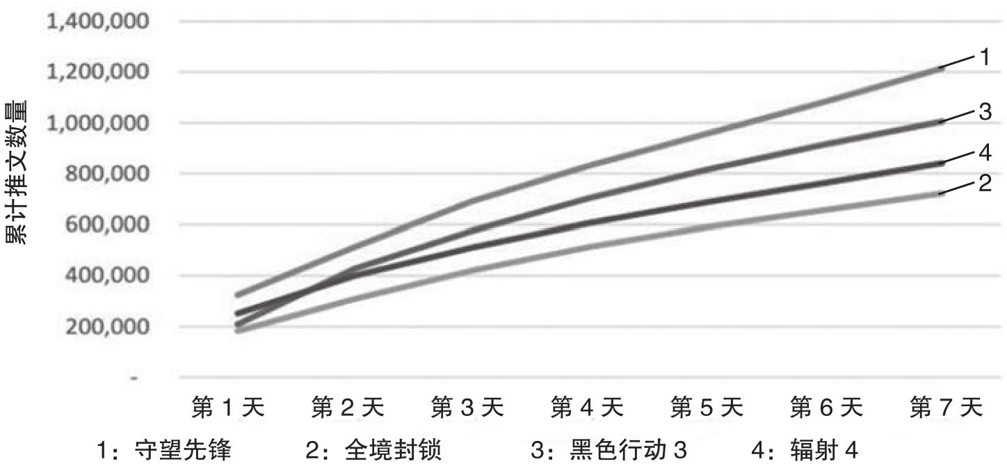 图2.31 四款游戏发布首周的推文数量