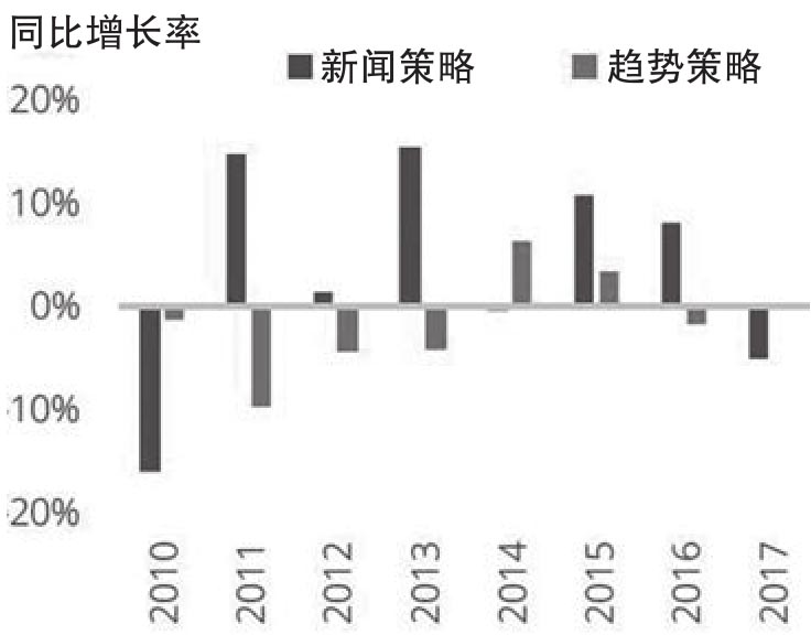 图3.7报告了针对不同汇率的新闻和趋势跟踪策略的绩效。现在可以针对这些汇率构造一篮子组合,图3.8给出了这两种策略在货币篮子上的投资绩效。和图3.7A相似,货币篮子的新闻策略明显好于趋势策略,两者的风险调整收益率分别是0.6和-0.3。图3.9则报告了两个货币篮子的交易策略年同比收益率,从中可以看出,在大多数年份中,新闻策略的绩效都强于趋势策略。唯一明显的例外是2010年,当时新闻策略的绩效严重落后于趋势策略。