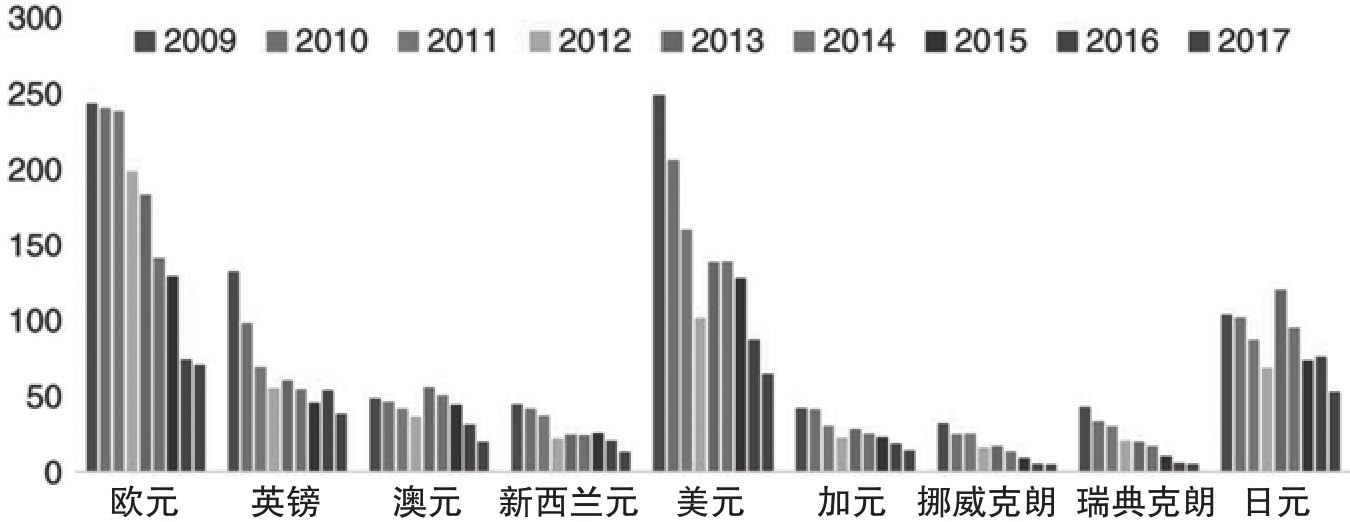Amen(2018)分析了十国集团(Group of 10/G10)成员国的货币,[5]这些货币是欧元(euro/EUR)、英镑(British pound/GBP)、澳元(Austrailian dollar/AUD)、新西兰元(New Zealand dollar/NZD)、美元(US dollar/USD)、加元(Canadian dollar/CAD)、挪威克朗(Norweigian krone/NOK)、瑞典克朗(Swedish krone/SEK)以及日元(Japnese yen/JPY)等九种货币。[6]为了快速获取和这些货币相关的新闻,Amen采用了一系列的过滤规则。首先他筛选出英文撰写的新闻,其次是首次发表的新闻报道,[7]接着是通过彭博新闻的资产标签进行过滤,[8]然后是对这些经济体的经济新闻进行筛选,[9]最后是对相关的金融监管机构(比如FED和ECB)进行筛选。图3.4以范例的形式表明了彭博终端上显示的和欧元/美元汇率相关的新闻。图3.5则给出了九种货币从2009年到2017年之间日平均新闻数量,其中清楚地表明欧元和美元的新闻数量是最多的。