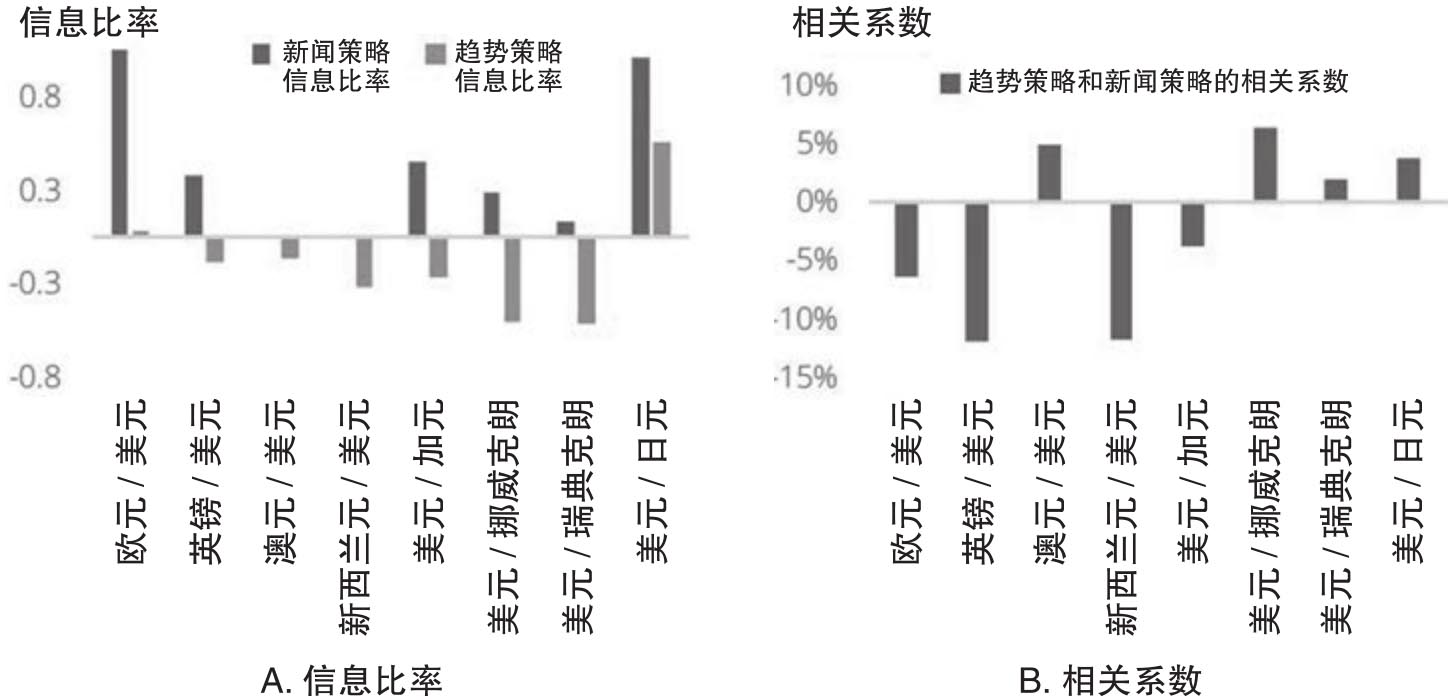 接下来Amen(2018)分析了一个简单的新闻动量交易规则:对于某个汇率而言,当市场情绪为正面时买入,而当市场情绪转为负面的时候卖出。图3.7对比了这个新闻策略和基于价格数据的趋势跟踪策略的投资绩效。图3.7A给出两个交易策略在不同汇率上的信息比率,也就是风险调整收益率。从中可以看出新闻策略是有利可图的,而趋势跟踪策略则往往表现不佳。图3.7B表明了这两种策略收益率之间的相关性,从中可以看到两者之间并不存在一致的趋势,这样对趋势跟踪策略而言,如果把新闻策略纳入其中就会获得分散化的好处。