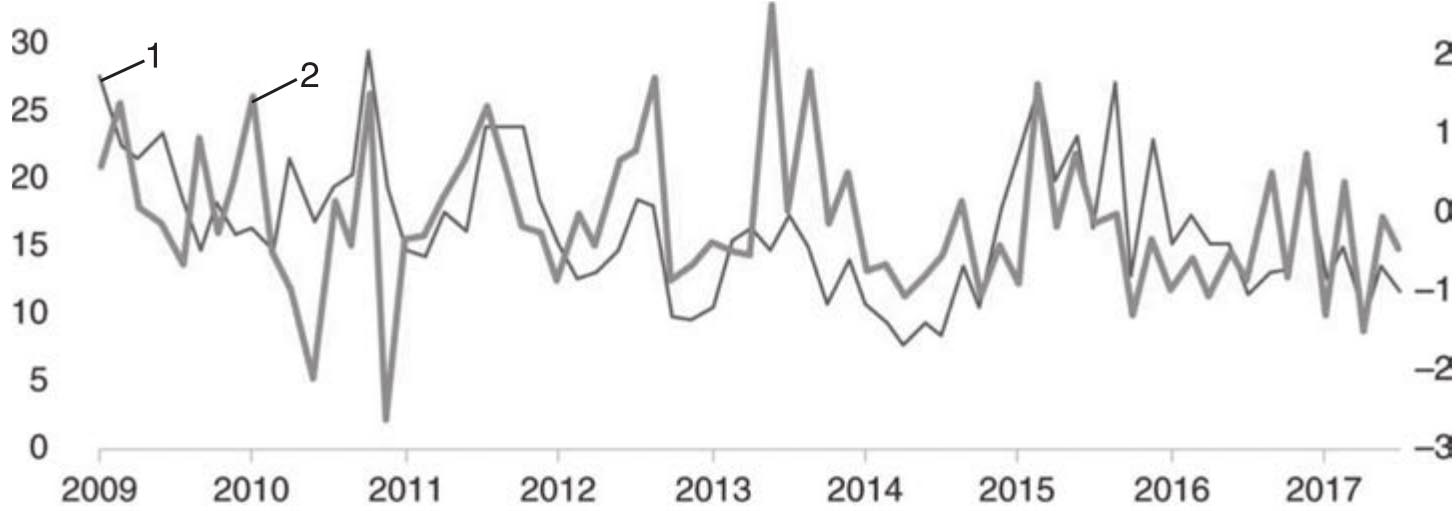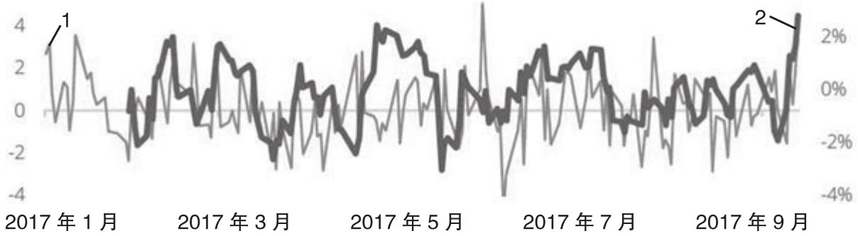 左侧坐标轴:美元/日元新闻情绪分数(用线1表示)右侧坐标轴:美元/日元汇率的周变化率(用线2表示)资料来源:Amen(2018)。