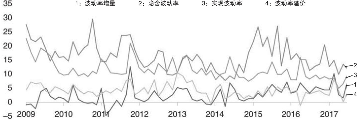 左侧坐标轴:新闻量分数(用线1表示)右侧坐标轴:1个月隐含波动率(用线2表示)资料来源:Amen(2018)。