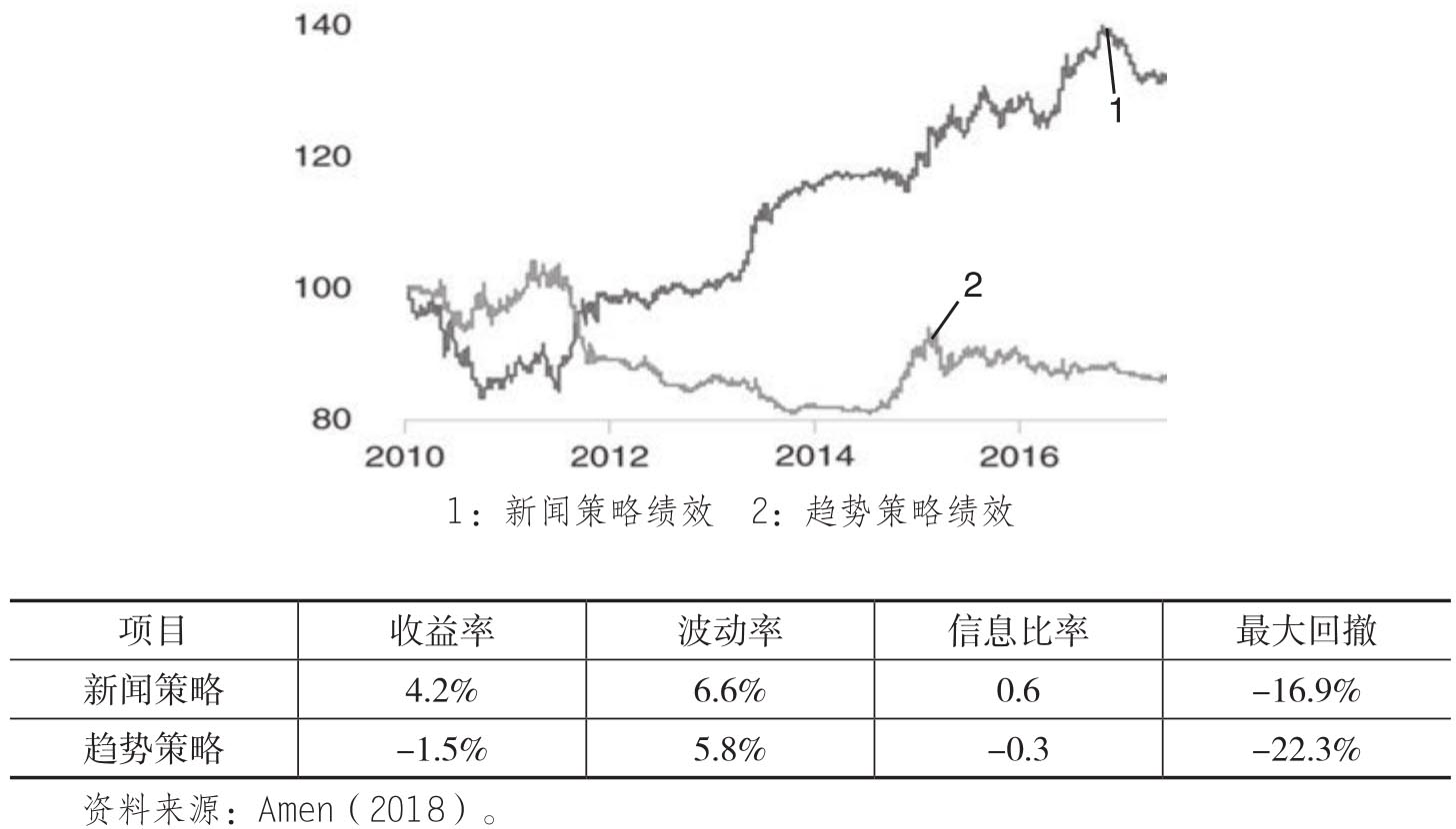 在第一章中我们讨论了如何从财经新闻中生成情绪指标,进而进行股票量化交易。Amen(2018)讨论了相似的问题,只不过应用场景从股票市场转变为外汇市场。具体来说,Amen分析了从2009年到2017年的彭博新闻(Bloomberg News/BN),从中给发达经济体的货币创建情绪分数,然后基于这些情绪分数进行外汇的方向交易。