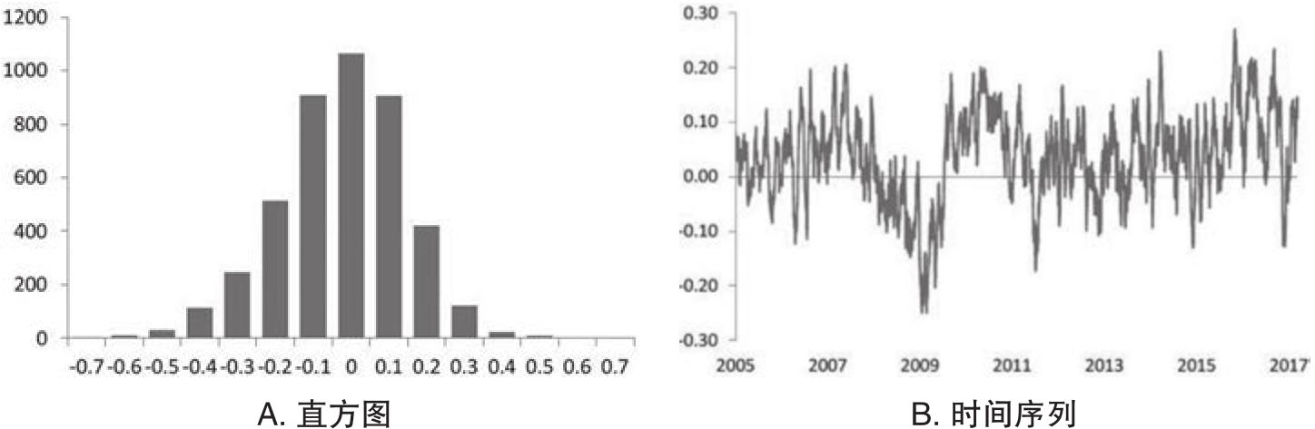 就全球债券市场而言,作者覆盖了澳大利亚、加拿大、丹麦、德国、英国、日本、瑞典、新西兰和美国等九个国家的国债市场。因为瑞文并没有针对债券市场发布情绪指标,因此KL就使用了各国的经济情绪指标作为替代变量。图3.15给出了美国债市情绪分数的直方图和时间序列。因为国债市场的走势往往和经济情势呈现负向关系,这样就可以基于经济情绪指标构建一个逆势的多空策略,具体而言,就是做多三个经济情绪最为负面国家的国债,同时做空三个经济情绪最为正面国家的国债。