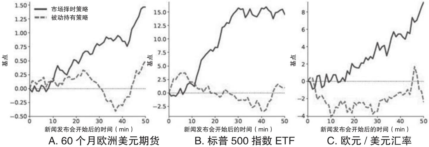 更进一步,Gómez-Cram/Grotteria对比了两个交易策略。第一个交易策略是市场择时,其思想是使用FOMC会议声明发布前后的半小时资产收益率作为交易信号:对于每种类型的资产,如果其价格在声明发布时上涨,那么就在新闻发布会开始时持有多头仓位,然后在新闻发布会结束的时候平仓。反之,当价格在声明发布时下跌,那么就在发布会开始时建立空头仓位,然后持有仓位到发布会结束。这个简单的择时策略不需要任何参数估计。与这个策略进行对比的就是简单持有策略,也就是无论FOMC发布的声明显示了什么信息都持有资产。图3.19比较了三种资产的主动择时和被动持有策略的平均累计日内收益率,这三种资产分别是60个月欧洲美元期货、标普500指数ETF和欧元/美元汇率。其中的横轴表示发布会开始后的时间(以分钟度量)。图中的实线跟踪了市场择时策略的收益率;而虚线则跟踪了被动持有策略的收益率。对于这三种资产来说,当新闻发布会进入到第10分钟也就是问答环节开始的时候,市场择时的相对优良绩效开始出现,其中标普500指数ETF看起来反应最为迅速,同时它的累计收益率在问答环节开始20分钟后稳定下来。而对于另外两种资产而言,从第10分钟开始直到最后,累计收益率一直呈现稳定增长的模式。