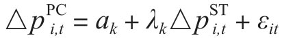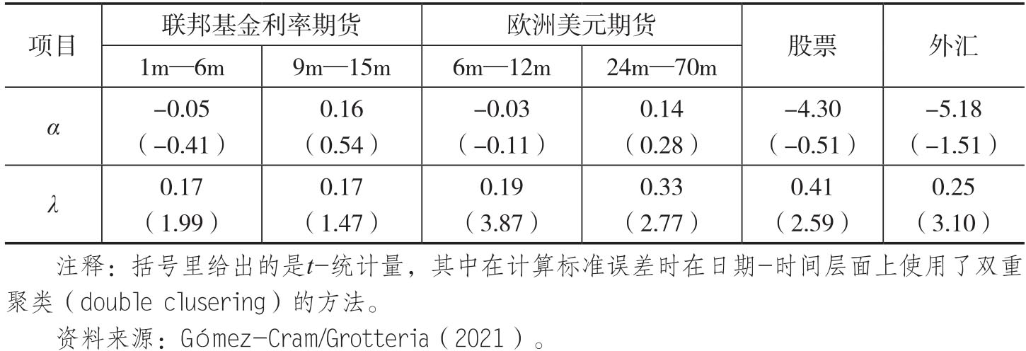 表示资产i在t日FOMC声明发布前后的价格变化。这两个指标的上标“PC”和“ST”分别表示新闻发布会(press conference/PC)和会议声明(statement/SC),同时资产属于某个资产类型k。这里的资产类型包括两组不同期限的联邦基金利率期货和欧洲美元期货以及股票和外汇等六个资产类型。表3.3报告了这六个回归的截距和斜率系数。从中可以看到,FOMC形成的发布会冲击和声明冲击之间存在着统计上显著的正向关系。除了联邦基金利率期货,其他所有资产类型的结果都非常明显。